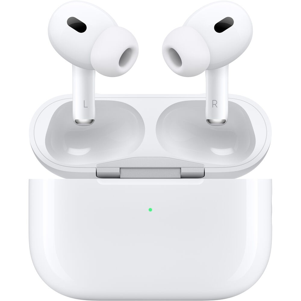 They also usher in a new dimension of sound with immersive Spatial Audio, making you feel like you're on stage with the band. Other aspects of the AirPods Pro have been upgraded, including ANC with double the cancellation power, a transparency mode that adapts to high-decibel sounds, and more. But that's not all: pair your AirPods Pro with the separately available Apple Vision Pro, and the H2 chip in these devices will communicate to transfer audio data at blisteringly high speeds, delivering fully lossless audio with extremely low latency, elevating your mobile audio experience to incredible new heights. The Airpods Pro include four sizes of silicone eartip pairs and a USB-C charging cable.