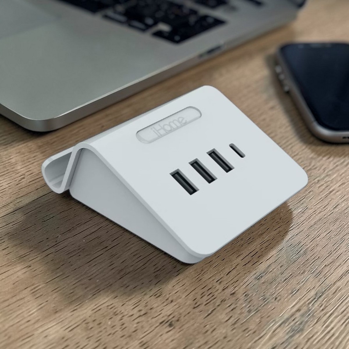 The unique iHome 4-in-1 Multiport Charger with Phone Stand can bear the weight of the mobile phone/tablet while charging multiple accessories. This is an excellent desktop/ nightstand USB charging, and provides an optimal viewing angle so you can check for charging. With USB-A and USB-C ports, charge up to four devices all at once. This functional piece provides convenience and portability and is a perfect charging accessory.