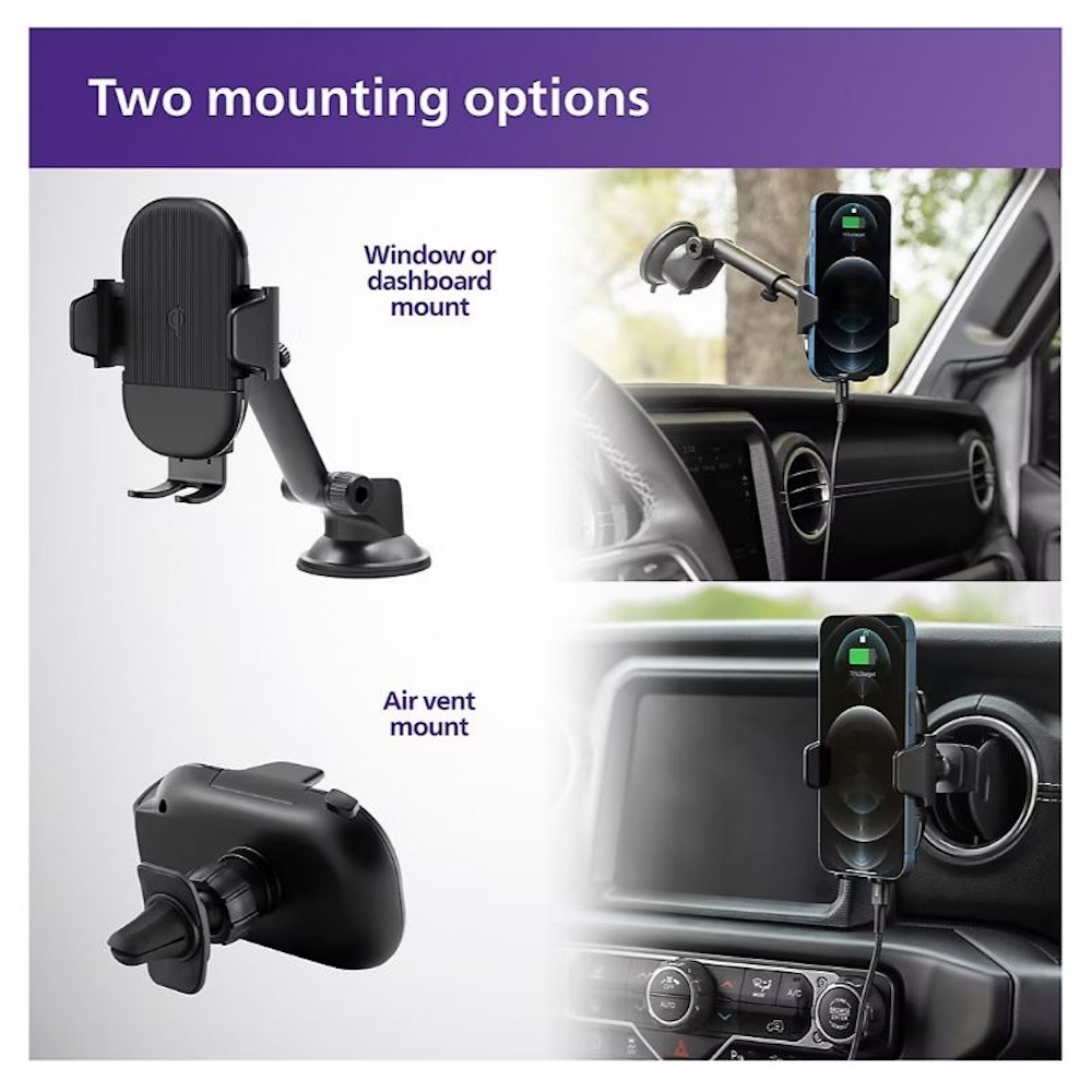 Stay charged and go hands-free with the Philips wireless charging two-in-one phone mount. This in-car mounting system includes everything needed to keep your phone powered up and in a convenient location for safe, hands-free access to navigation apps, playlists and calls. The 15W Qi-enabled mounting cradle accommodates phones 2.5”–3.75” wide and easily adjusts to secure your phone in place. This wireless car charger mount also includes a USB 3.0 15W car charger and a 3’ USB cable to supply power from your car’s AUX port or cigarette lighter socket to the mounting cradle – providing fast, efficient charging of your Qi-enabled phone.