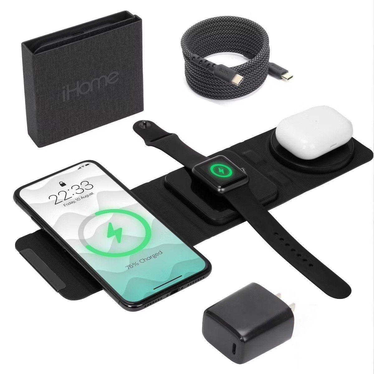 iHome 3-in-1 Foldable Wireless Charging Pad with USB-C Wall Charger and USB-C to A Cable 2IHQI2233D0L2