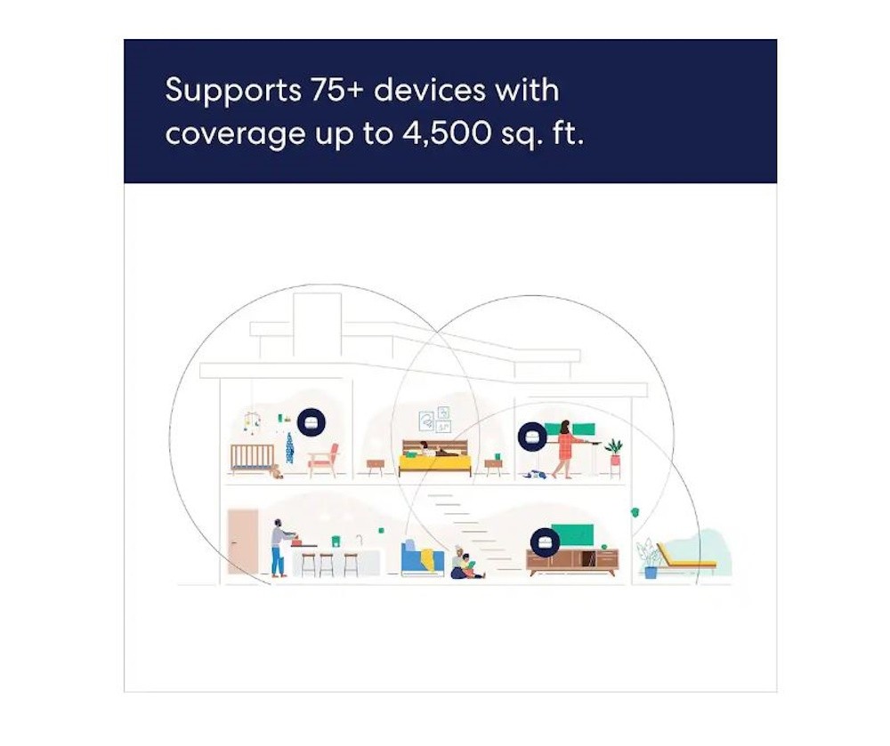 An eero 6+ (3-pack) covers up to 4,500 sq. ft. with wifi, delivers wifi speeds up to a gigabit, and supports 75+ connected devices.